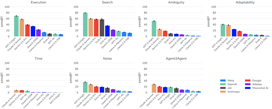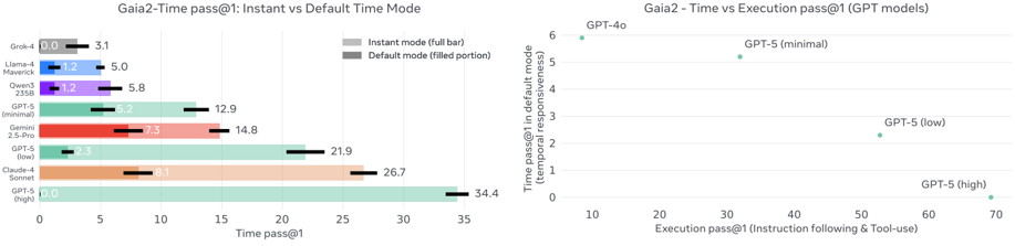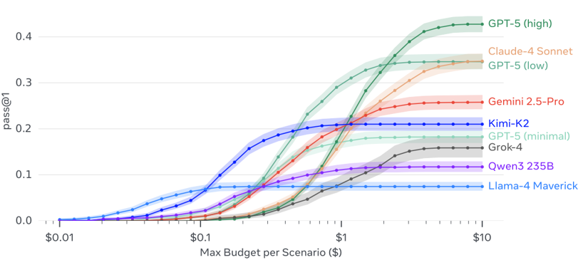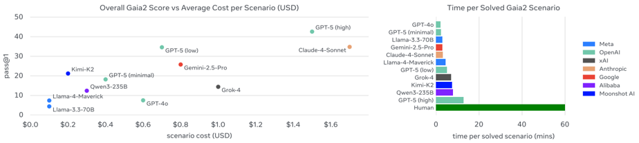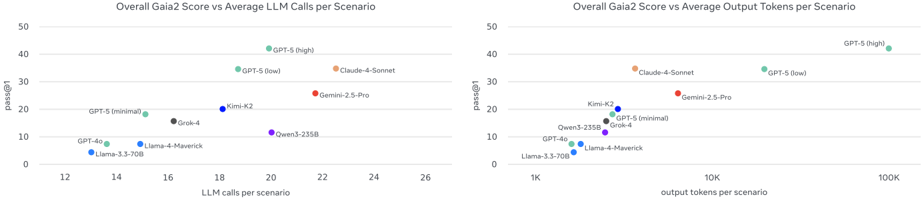 Figure 1 Gaia2 budget scaling curve: for each max_budget, we plot ∑ ✶ { scenario_result = True ∧ scenario_cost < max_budget . Equipped with a simple ReAct-like scaffold (see Section 2.4), no model evaluated here dominates across } the intelligence spectrum-each trades off capability, efficiency, and budget. At equal cost, some models fare better, yet all curves plateau, suggesting that standard scaffolds and/or models miss key ingredients for sustained progress. Cost estimates from Artificial Analysis model pricing data (accessed September 10, 2025).