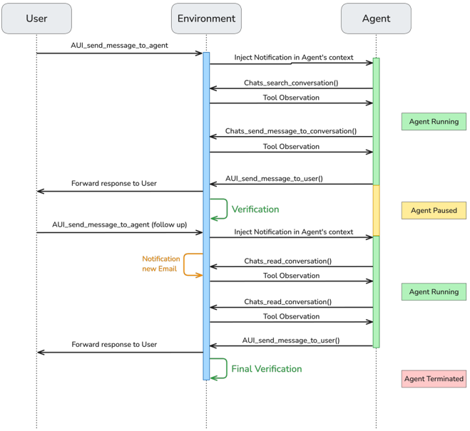 Scenario runtime Scenarios typically start with an environment instance and a send_message_to_agent tool call, waking the agent up. The environment operates on discrete time steps, executing scheduled events and managing state transitions until the agent reaches an exit condition, see Figure 3. All interactions with the user are through the AgentUserInterface , with verification triggered upon task completion.