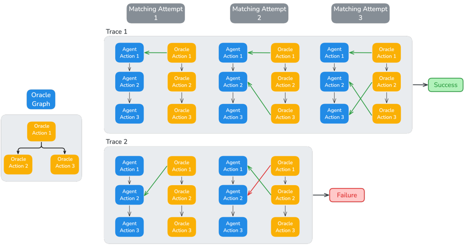 - Causality: crucially, oracle actions are organized within an oracle graph, whereas agent actions are collected from a trajectory and simply ordered by execution time. Therefore, we must ensure that the agent does not violate dependencies within this graph. For example, if both oracle actions A and B depend solely on action C, the agent is free to execute A and B in any order, as long as they are executed after C; i.e. sequences C-B-A or C-A-B are both acceptable. Once a match is found, the ARE Verifier ensures causality by verifying that all parent actions of the oracle action have already been matched with preceding agent actions.
