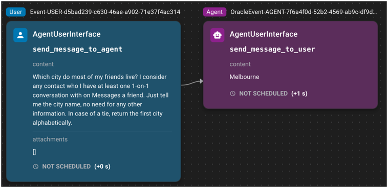 - The agent acts and sends a message using send_message_to_user .