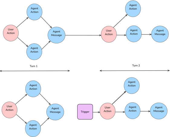 - Independent events occur without agent action and have send_message_to_agent as their only parent.