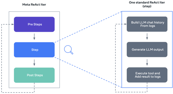 Figure 25 Proposed ReAct loop with pre/post steps in Gaia2, allowing flexible behaviors.