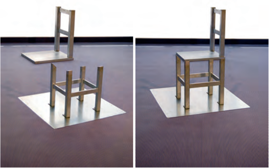 Figure 2.1: The left panel shows a generic view of the (separate) parts comprising a Beuchet chair. The right panel shows the illusory percept of a chair if the parts are viewed from a single, very special vantage point. From this accidental viewpoint, we perceive a chair. (Image courtesy of Markus Elsholz.)