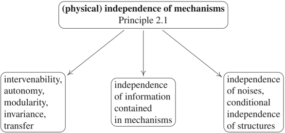 It is noteworthy, and indeed a motivation for writing the present book, that among the different implications of Principle 2.1, shown in Figure 2.2, most of the work using causal Bayesian networks only exploits the independence of noise terms. It leads to a rich structure of conditional independences [Pearl, 2009, Spirtes et al., 2000, Dawid, 1979, Spohn, 1980], ultimately deriving from Reichenbach's Principle 1.1. The other aspects of independence received significantly less attention [Hausman and Woodward, 1999, Lemeire and Dirkx, 2006], but there is a recent thread of work aiming at formalizing and using them. A major motivation for this has been the cause-effect problem where conditional independence is useless since we have only two variables (see Sections 4.1.2 and 6.10). Janzing and Schölkopf [2010] formalize independence of mechanism in terms of algorithmic information theory (Section 4.1.9). They view the functions in an SCM as representing independent causal mechanisms that persist after manipulating the distribution of inputs or other mechanisms. More specifically, in the context of causal Bayesian networks, they postulate that the conditional distributions of all nodes given their parents are algorithmically independent. In particular, for the causal Bayesian network X → Y, PX and P{Y|X} contain no algorithmic information about each other meaning that knowledge of one does not admit a shorter description of the other. The idea that unrelated mechanisms are algorithmically independent follows from the generalization of SCMs from random variables to individual objects where statistical dependences are replaced with algorithmic dependences.