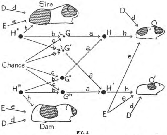 Figure 2.3: Early path diagram; dam and sire are the female and male parents of a guinea pig, respectively. The path coefficients capture the importance of a given path, defined as the ratio of the variability of the effect to be found when all causes are constant except the one in question, the variability of which is kept unchanged, to the total variability. (Reproduced from Wright [1920].)