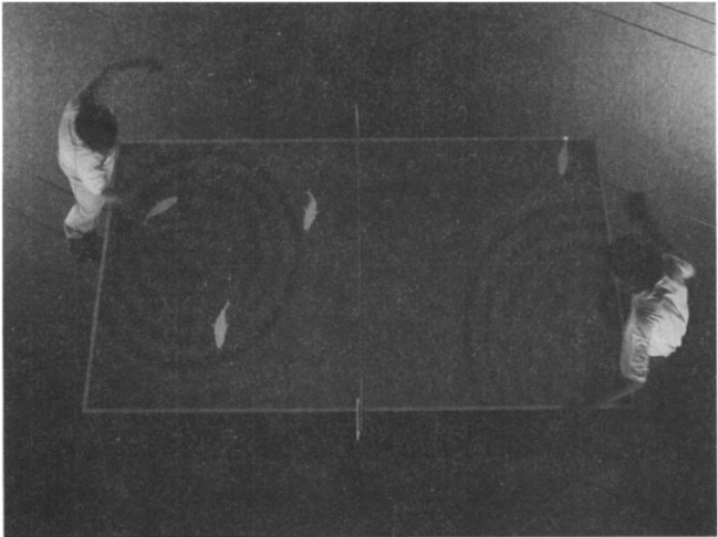 But Hiroshi has more delights to show. Imagine trying to play table tennis on a school of fish, as in figure 4.1. There they are, swimming about the table, their images delivered by a projector located in the ceiling above the table. Each time the ball hits the table surface, the ripples spread out and the fish scatter. But the fish can't get away-it's a small table, and no matter where the fish go, the ball soon scatters