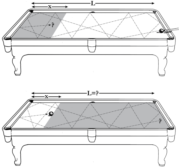 FIGURE 3.2. Thomas Bayes's pool table example. In the first version, a forwardprobability question, we know the length of the table and want to calculate the probability of the ball stopping within x feet of the end. In the second, an inverseprobability question, we observe that the ball stopped x feet from the end and want to estimate the likelihood that the table's length is L . ( Source: Drawing by Maayan Harel.)