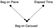 This diagram reflects the intuitive idea that there are two causes for the appearance of any bag on the carousel. First, it had to be on the plane to begin with; otherwise, it will certainly never appear on the carousel. Second, the presence of the bag on the carousel becomes more likely as time passes… provided it was actually on the plane.