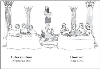 The biblical story of Daniel, often cited as the first controlled experiment. Daniel (third from left?) realized that a proper comparison of two diets could only be made when they were given to two groups of similar individuals, chosen in advance. King Nebuchadnezzar (rear) was impressed with the results. ( Source: Drawing by Dakota Harr.)