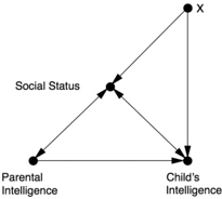 In this diagram, Burks has used some double-headed arrows, either to represent mutual causation or simply out of uncertainty about the direction of causation. For simplicity we are going to assume that the main effect of both arrows goes from left to right, which makes Social Status a mediator, so that the parents' intelligence elevates their social standing, and this in turn gives the child a better opportunity to develop his or her intelligence. The variable X represents 'other unmeasured remote causes.'