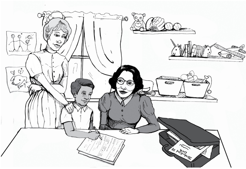 FIGURE 9.3. Barbara Burks (right) was interested in separating the 'nature' and 'nurture' components of intelligence. As a graduate student, she visited the homes of more than two hundred foster children, gave them IQ tests, and collected data on their social environment. She was the first researcher other than Sewall Wright to use path diagrams, and in some ways she anticipated Wright. ( Source: Drawing by Dakota Harr.)