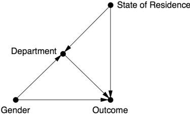 Kruskal argued that the analysis in this situation should control for both the department and the state of residence, and a look at Figure 9.5 explains why this is so. To disable all but the direct path, we need to stratify by department. This closes the indirect path Gender Department Outcome. But in so doing, we open the spurious path Gender Department State of Residence Outcome, because of the collider at Department. If we control for State of Residence as well, we close this path, and therefore any correlation remaining must be due to the (discriminatory) direct path Gender Outcome. Lacking diagrams, Kruskal had to convince Bickel with numbers, and in fact his numbers showed the same thing. If we do not adjust for any variables, then females have a lower admission rate. If we adjust for Department, then females appear to have a higher admission rate. If we adjust for both Department and State of Residence, then once again the numbers show a lower admission rate for females.