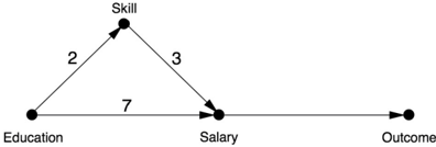 Thus, the direct effect is either zero or one depending on the constant value we choose for the mediator. Unlike in Linear Wonderland, the choice of a value for the mediator makes a difference, and we have a dilemma. If we want to preserve the additive principle, Total Effect = Direct Effect + Indirect Effect, we need to use CDE(2) as our definition of the causal effect. But this seems arbitrary and even somewhat unnatural. If we are contemplating a change in Education and we want to know its direct effect, we would most likely want to keep Skill at the level it already has. In other words, it makes more intuitive sense to use CDE(0) as our direct effect. Not only that, this agrees with the natural direct effect in this example. But then we lose additivity: Total Effect ≠Direct Effect + Indirect Effect.