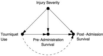 However, because Kragh studied only the patients who actually survived long enough to get to the hospital, he was also conditioning on the mediator, Pre-Admission Survival. In effect, he was blocking the indirect path from tourniquet use to post-admission survival, and therefore he was computing the direct effect, indicated by the dashed arrow in Figure 9.13. That effect was essentially zero. Nevertheless, there still could be an indirect effect. If tourniquets enabled more soldiers to survive until they got to the hospital, then the tourniquet would be a very favorable intervention. This would mean that the job of a tourniquet is to get the patient to the hospital alive; once it