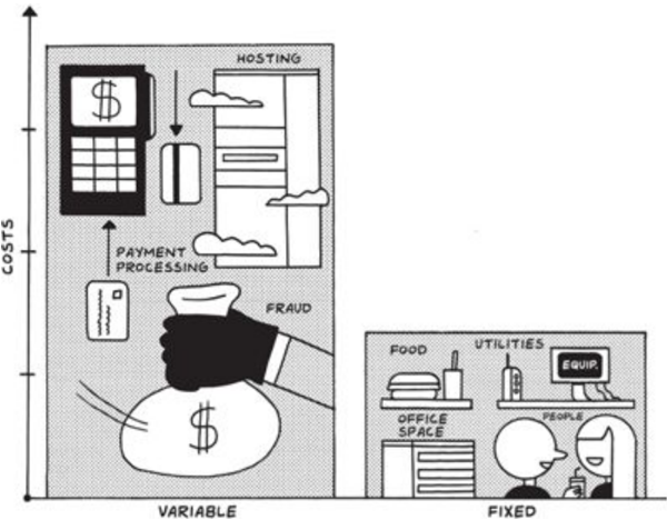There are two kinds of costs. The first is variable cost, also referred to as the 'cost of goods sold,' or COGS: the cost associated with selling each marginal unit of product. In brick-and-mortar businesses, that includes costs like labor, packaging, raw materials, and more. For software businesses in the 1990s, COGS were non-zero because software was put onto CDs and sold in retail stores.