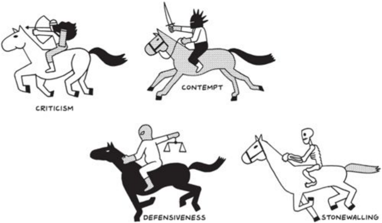 - Read about 'The Four Horsemen' by the Gottmans, starting here: www.gottman.com/blog/the-four-horsemen-recognizing-criticismcontempt-defensiveness-and-stonewalling/.